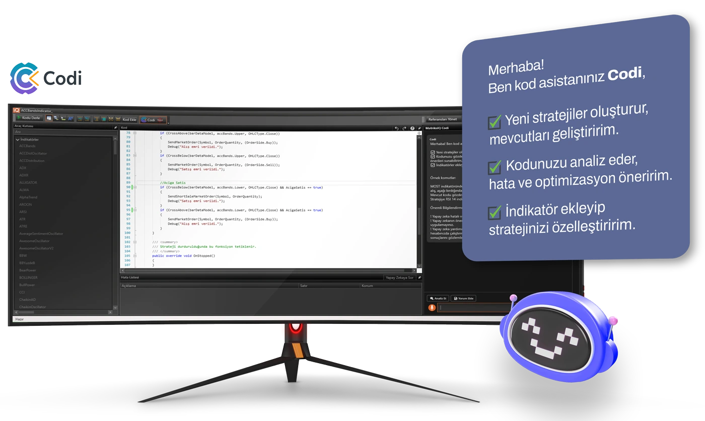 Finansal piyasalarda algoritmik işlem yapmak, taramalar oluşturmak artık çok daha hızlı, kolay ve erişilebilir! MatriksIQ’nun yapay zekâ kod asistanı Codi sayesinde, sürekli gelişen veri havuzumuzla yapay zekanın birleşmesi ile kullanıcıların doğal dil komutlarıyla strateji ve Explorer(tarama) oluşturmasına olanak tanıyor.