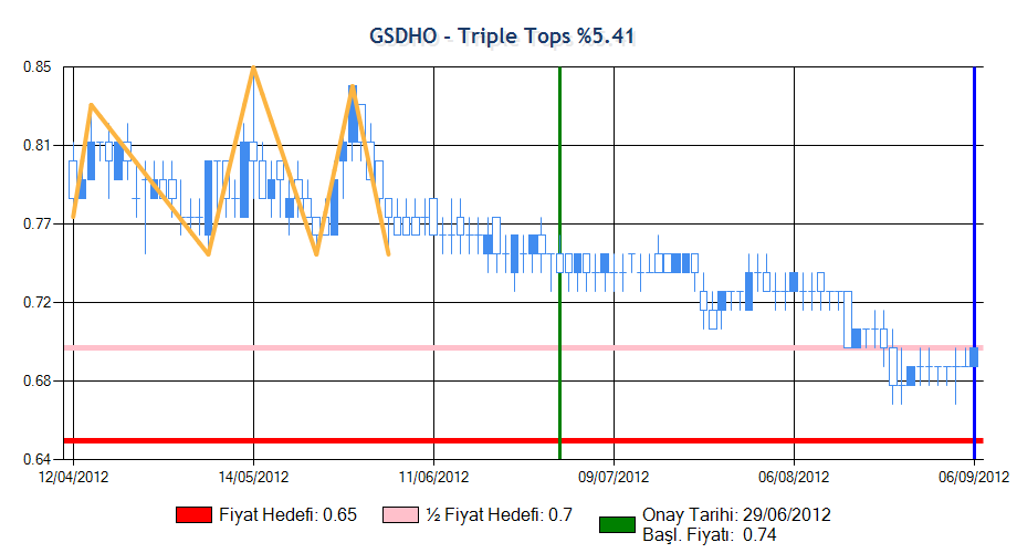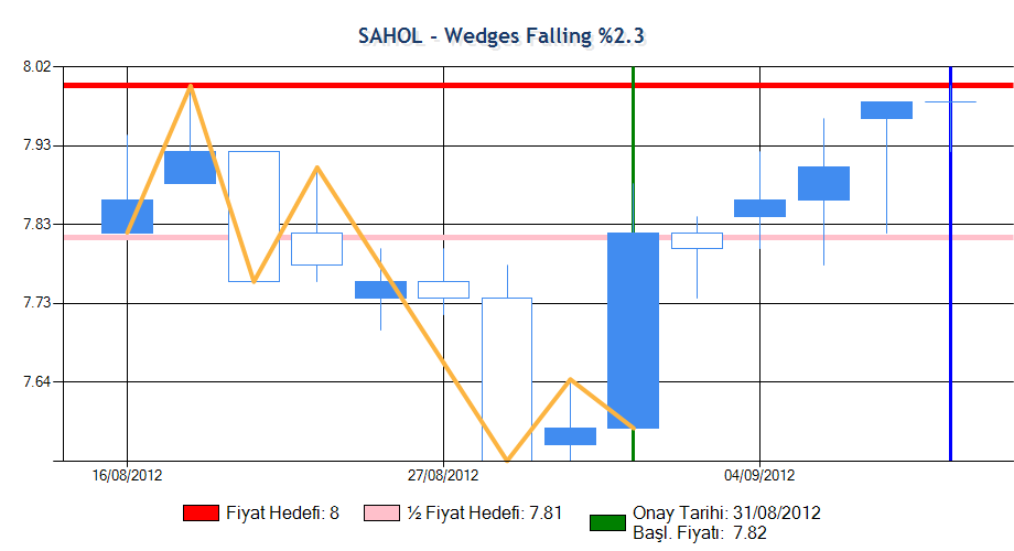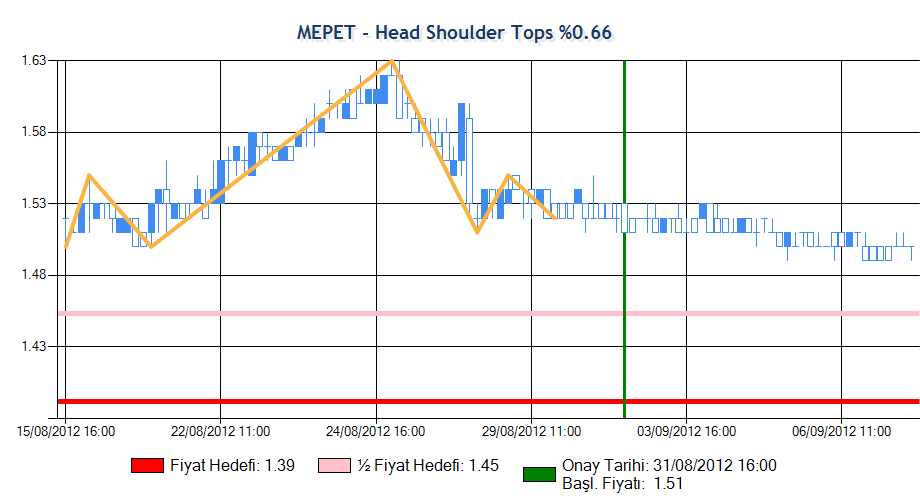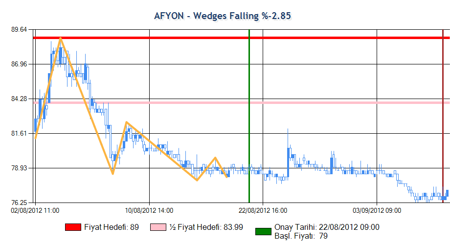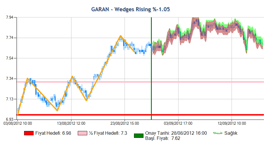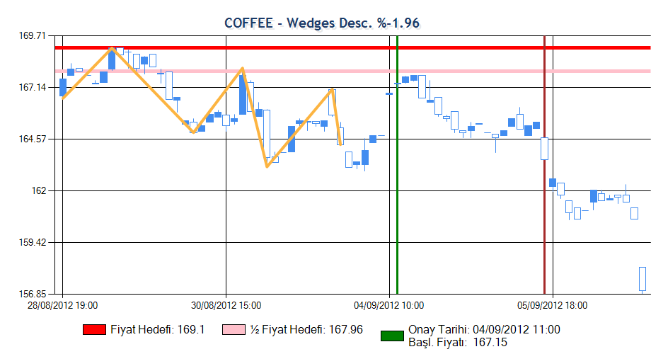 Formasyon onay fiyatına ulaşmış ardından beklenen yöne hareket sergileyerek yarım fiyat hedefine ulaşmış ama ardından düşüşe geçmiştir. Sistem zararı azaltmak için formasyonu sonlandırmıştır.