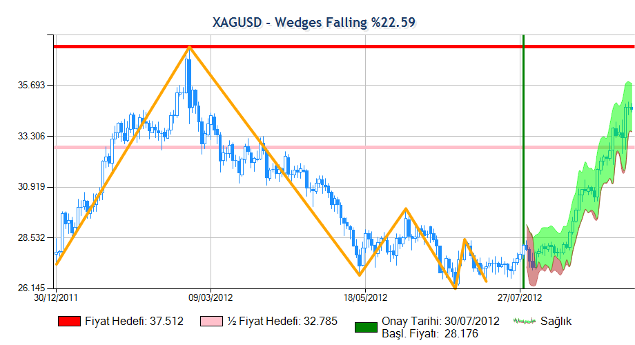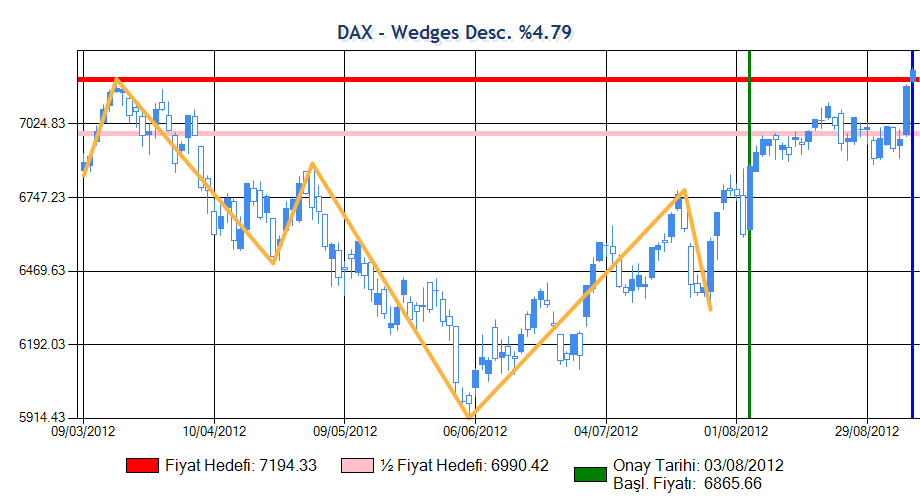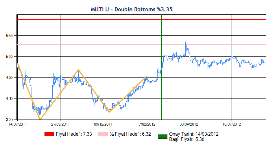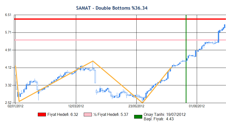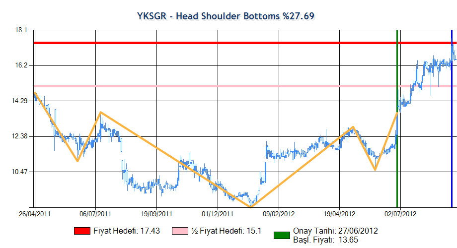 Formasyon onay fiyatına erişip onaylandıktan sonra yarım fiyat hedefini geçmiştir. Yarım Fiyat Hedefi grafikte pembe ile gösterilmektedir ve beklenen değer grafiğin altında verilmiştir.