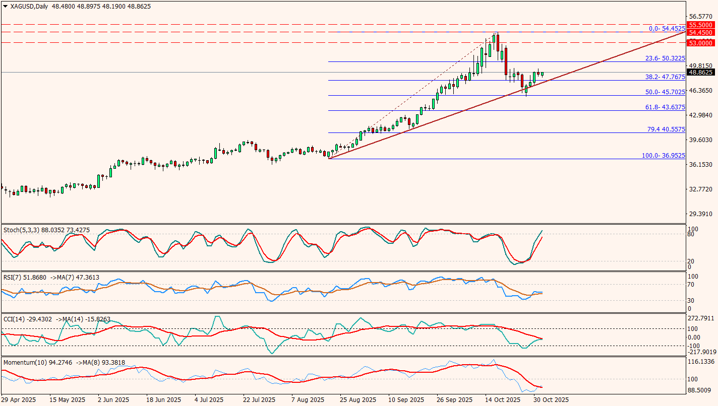 Ons Gümüş kısa vadede yükselen trend çizgisi üzerinde tutunma çabasını sürdürüyor. Fiyat, geçtiğimiz haftaki sert geri çekilmenin ardından 38,2% Fibonacci düzeltme seviyesi olan 47,76 bölgesinden destek bularak yeniden yukarı yönlü bir ivme yakaladı. Bu bölge aynı zamanda trend desteğiyle kesiştiği için teknik olarak önemli bir bölge olarak izleniyor.