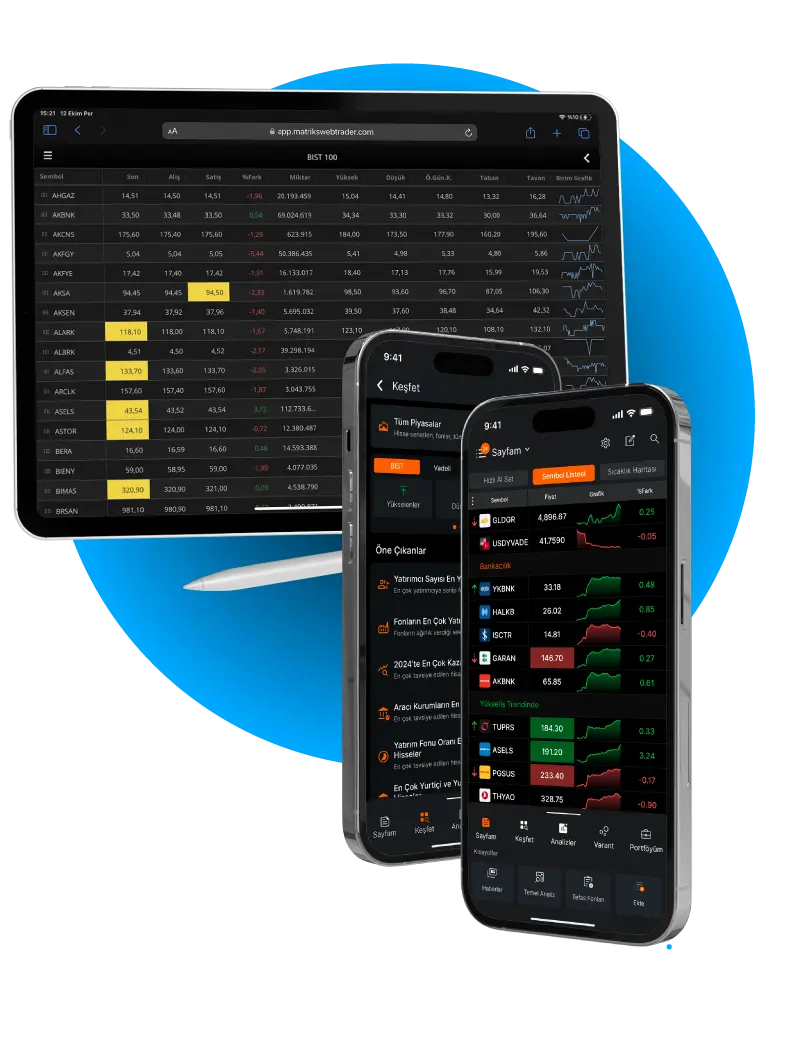 - • Canlı borsa verisi takibi Matriks Mobile IQ ve Matriks Web Trader platformları üzerinden sağlanır. Lisans kullanımı aynı anda tek bir platform üzerinden gerçekleştirilebilir. Eş zamanlı olmamak kaydıyla, aynı kullanıcı bilgileri ile her iki platformdan anlık veri izlenebilir.